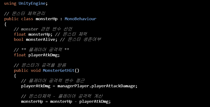 MonsterGetHit 메소드 괄호안에 float 변수 playerAtkDmg 파라미터가 적용되었으며,