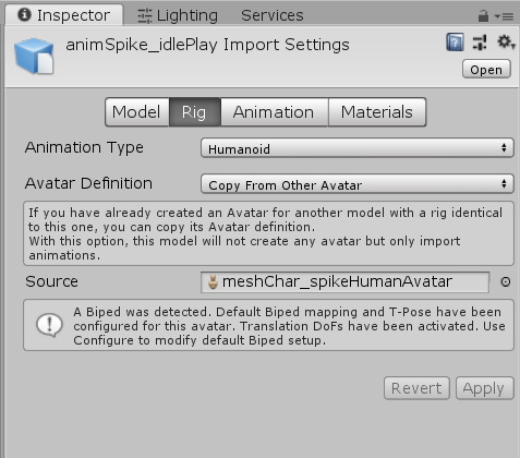 mesh 뼈대의 구조가 변경되었으므로, 재생하고자 하는 Humanoid Animation 애니메이션에도 동일한 구조의 뼈대 설정으로 맞춰야 의도된 애니메이션을 재생할 수 있습니다.